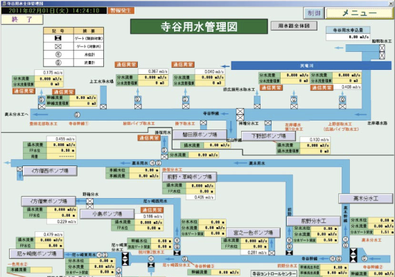 当土地改良区は平成6年度にシステムを導入し、計画的に更新しています。現在21箇所の分水工、ポンプ場の水量が寺谷コントロールセンターで集中管理されています。