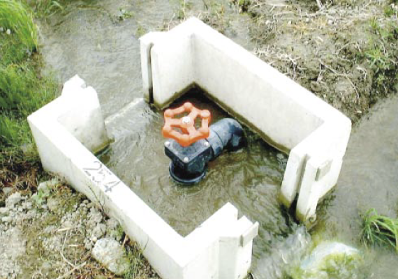 分水工は文字どおり幹線水路の水を支線水路に分ける施設のことです。水量を公平に分けることができるよう科学的に算出して断面を決めています。また、分水工には水門ゲートが設けられており、ゲートの開閉によって水の量を細かく調整できるため、水を無駄なく使うことができます。